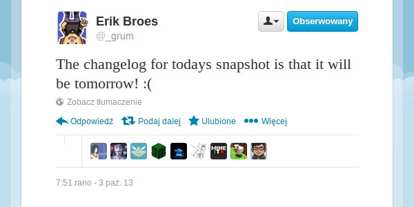 Niestety, Mojang nie uszanuje dziś swojej tradycji snapshotów w czwartek, więc najnowsze zmiany poznamy najwcześniej jutro. Erik „Grum” Broes obiecał w zamian przedstawienie gotowej listy zmian, ale czy dotrzyma obietnicy? Dowiemy się jutro…