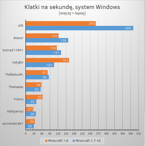 Jak widać, wyniki pomiarów są dość niejednoznacznie. Na niektórych komputerach Minecraft w wersji 1.8 zyskuje kilka (a nawet kilkanaście) klatek na sekundę więcej względem swojego poprzednika, a na kolejnych lepiej sprawuje się wersja 1.7.10. Tutaj da się zauważyć tendencję do większej wydajności na nowszych komputerach podczas, gdy starsze konfiguracje sobie nie radzą. W tym przypadku najlepszym sposobem jest po prostu sprawdzenie, czy na Waszych komputerach gra działa lepiej bądź gorzej.