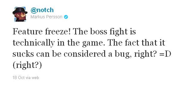 Całkiem niedawno Notch zapowiedział, że możemy już mówić o "feature freeze" – dla zwykłego zjadacza chleba pewnie mało to mówi, jednak dla kogoś kto interesuje się tym co nowego do gry dodaje Mojang powinno mieć duże znaczenie – nie zobaczymy bowiem aż do wydania gry żadnej nowości. Jeśli liczycie, że Notch doda jeszcze coś do gry to możecie się spodziewać, że wyjdzie to tylko i wyłącznie jako dodatek, najpewniej płatny dodatkowo.