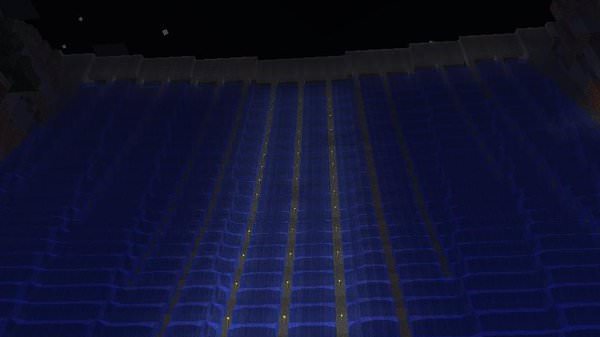 To pierwsza taka budowla, którą pokazujemy na naszym portalu – nie mniej jednak jej rozmiary budzą podziw. Poza jej wielkimi gabarytami imponujący jest system zarządzania przepływem wody, przy którym skorzystano z pluginu Wireless Redstone, służącym do bezprzewodowego wysyłania sygnału redstone. Mamy tu w pełni sprawne turbiny i bramy kontrolujące przepływ wody. Te ostatnie są wystarczająco wysokie, by przepłynąć łódką